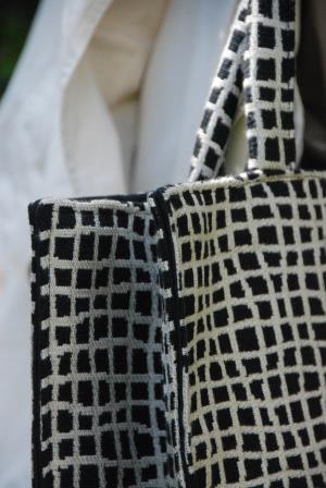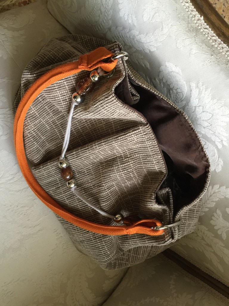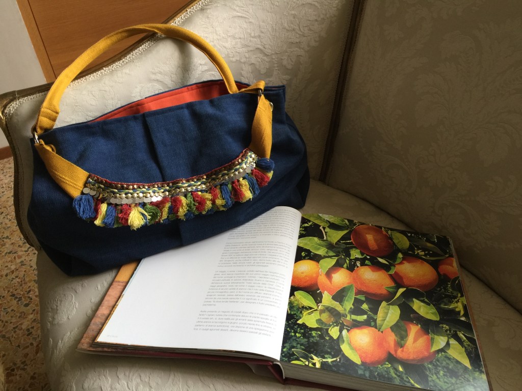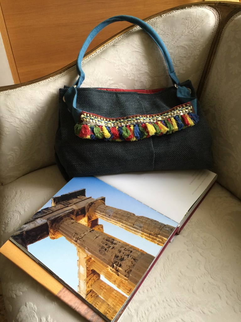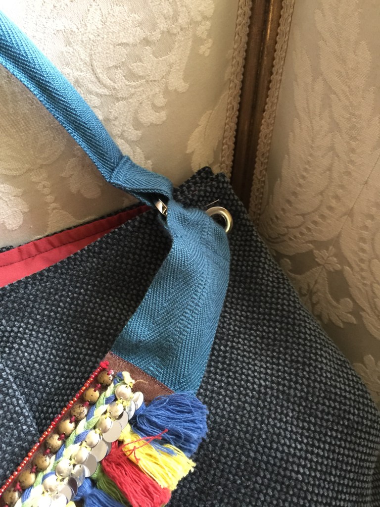 MODELLO SOFIA – borsa realizzata a mano in tessuto per arredamento, impugnatura con fascia in nylon interno con fodera in seta
